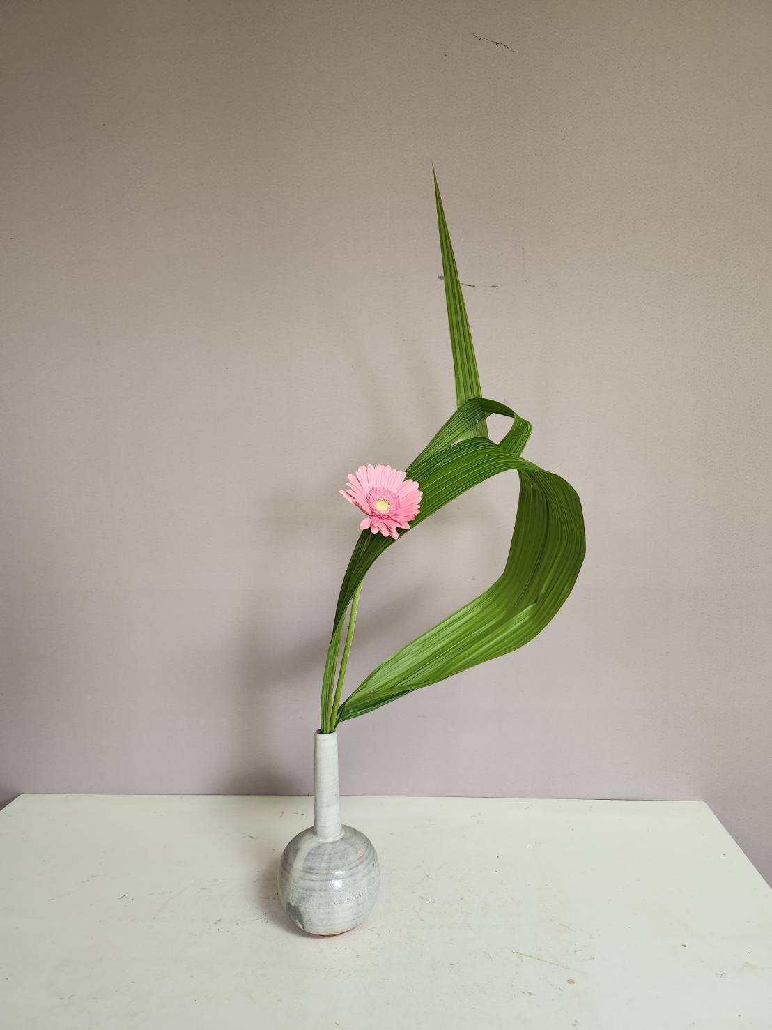 ピンクのガーベラとカークリコを使った一輪挿しです。